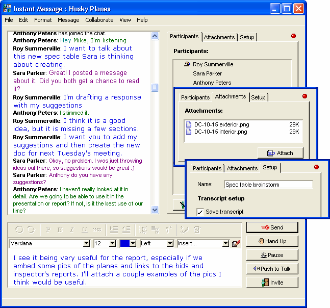 Team members can meet in a public instant messaging session, instant message each other on-the-fly, or meet in a discussion conference. This is ideal when team members are on the road or working in separate locations. In an instant messaging session, team members can throw out ideas while the secretary records them in the graphic organizer, or the secretary can use the auto-generated transcript later to compile the ideas.