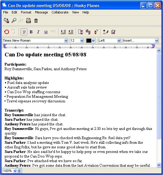 The team uses instant messaging to hold meetings when they can't get together. Here is an online meeting they held recently.