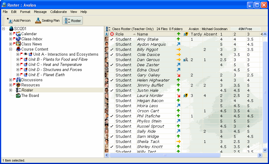 The class Roster displays a list of students in the class. From here, the teacher can add or remove students, view student information by double-clicking a student, track the status of students who require special assistance, create a seating chart, and view and add marks. At a glance, the teacher can see information about each student (for example, performance level or medical issues).