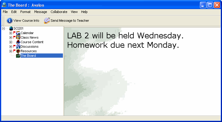 This is the teacher and students' initial view of the class, similar to the chalkboard or whiteboard that students see when they enter their physical classroom. The teacher should use this area to post urgent messages, formal announcements, reminders, or anything else the teacher feels is appropriate.