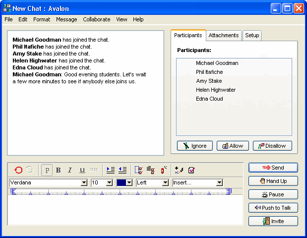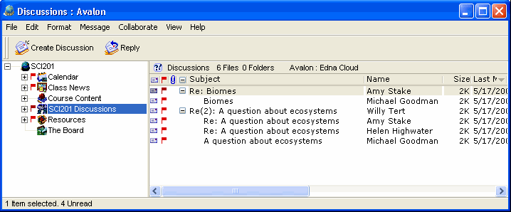From your My Classes area, you can access the Discussions area within each class. It is here that you can talk to the teacher and students and continue your classroom discussions -- from the comfort of your home, or any location where you have an Internet connection and a FirstClass ED client.