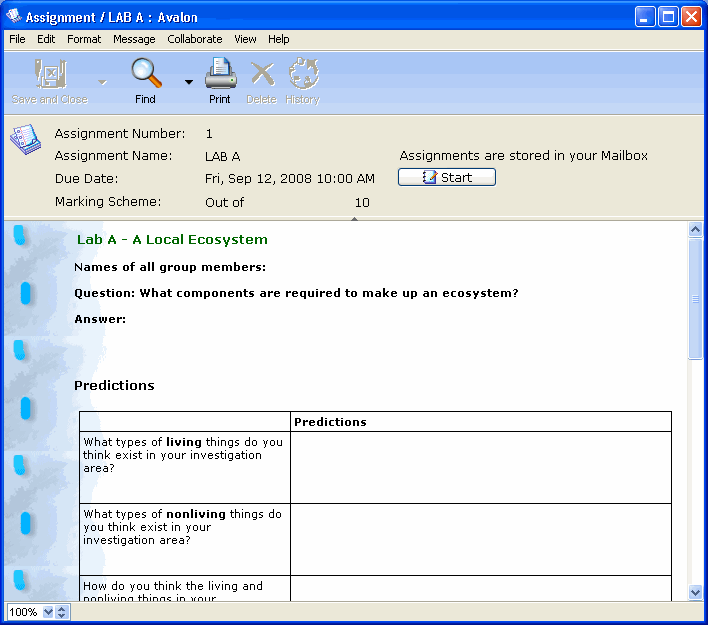 To start an assignment, click Start from the assignment in Course Content. Then complete the assignment online from your Mailbox, and click Hand In when you are finished. This way, the assignment is completely managed from your Mailbox, and you never have to pick up a pen or print out the assignment.