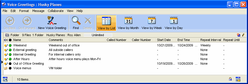 When the voice menu is complete, the Voice Greetings folder will look like this (there may be additional greetings):