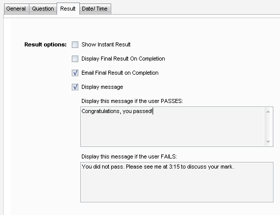 • Select whether to display a message with the test results (Display message). If so, enter the text students will see based on whether they passed or failed.