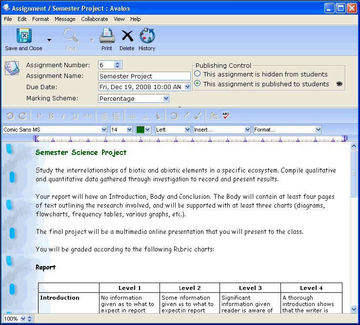 In this example, a teacher has added a rubric chart to the instructions in his Science project assignment.