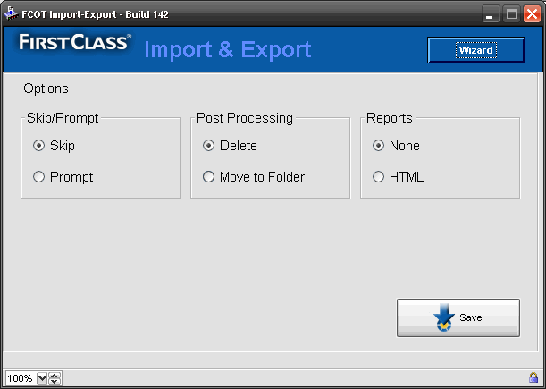 The Options button is a toggle button between the options screen and the Wizard. Click it to view or change the options, and then click Wizard to return to the Import/Export utility wizard.