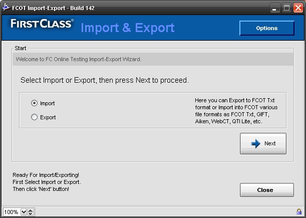 The Import/Export utility is a wizard that walks you through importing or exporting question and/or test files to/from the FirstClass Online Testing (FCOT) application. It imports or exports one file at a time, and only supported question types are imported/exported (True/False, Matching, Multiple Choice, and so on).
