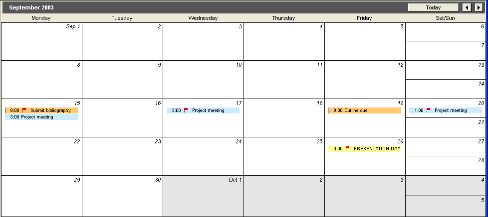 He can also differentiate events with color. For example, he may use one color to schedule meetings, and another to schedule milestones.