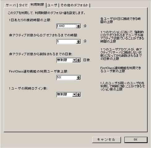 1日の間に (午前0時1分からつぎの午前0時まで) 、ユーザがサーバに接続できる最大分数です。無制限にするには1440と入力します。各ユーザや各ユーザグループごとに接続時間を設定して、このデフォルト値より優先して適用させることができます。管理者と副管理者には、この制限は適用されません。