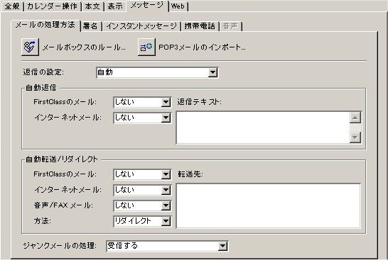 このタブを使用して、自分のメールを処理するデフォルトの方法を設定します。このデフォルト設定は、会議室内のメッセージには適用されません。