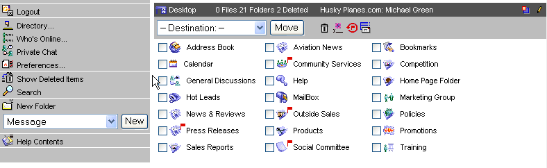 Your web site can include standard FirstClass forms, documents conferences and calendars, HTML files, and graphics. Depending on your resources, you can make your web site as simple or elaborate as required. Let’s take a look at the web site for Husky Planes.