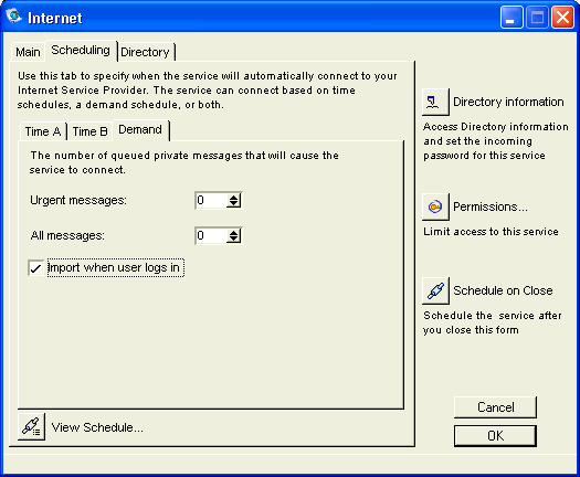 You should configure your Demand tab according to how many messages you want queued before initiating an automatic dial-up connection. For example, if you want all urgent messages sent out immediately, set Urgent Messages to a lower number. If you don’t require all your messages to go out immediately, set All messages to a higher number.