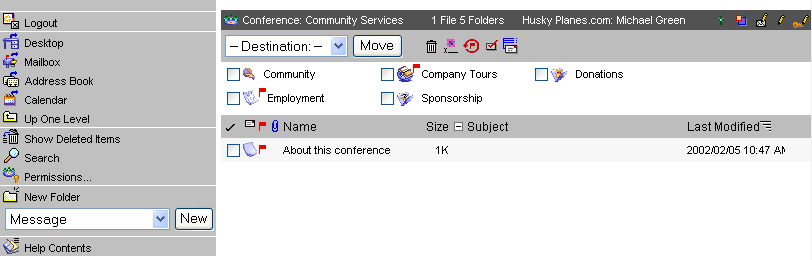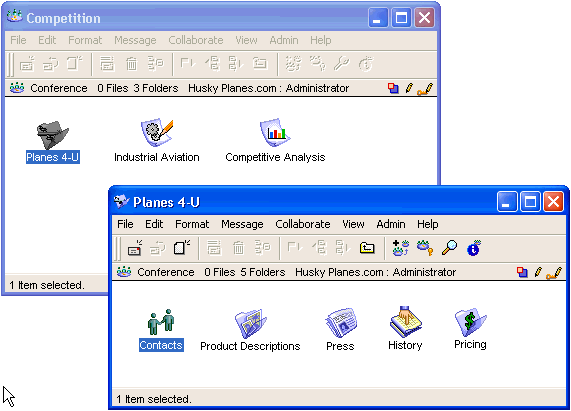 Your web site can include standard FirstClass forms, documents conferences and calendars, HTML files, and graphics. Depending on your resources, you can make your web site as simple or elaborate as required. Let’s take a look at the web site for Husky Planes.