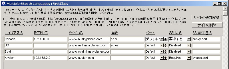 各サイトは、[WWW]フォルダ内にある各サイトのフォルダに関連付けされたエイリアス名を持っています(ただし、IPアドレスは同じです)。すべてのドメインは、同じIPアドレスに名前解決されます。また、ドメインネームサーバ(DNS)にドメイン名を設定して、他のサーバがこれらのドメイン名を認識できるようにします。各サイトで様々な言語に対応できるため、[言語]欄に言語のISOコードを入力します(例えば、フランス語ならfr、スペイン語ならes、日本語ならjaとなります。詳細は、インターネットサービスのリソースについてを参照してください。言語の入力順は、先頭の言語だけが重要です。これは、先頭の言
