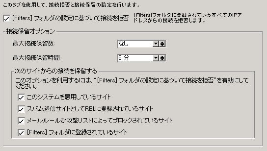 不必要な接続を保留するには、[インターネットの基本設定(Basic Internet Setup)]フォームの[接続]タブで、[[Filters]フォルダの設定に基づいて接続を拒否]を有効にし、[Filters]フォルダ内のフィルタリング用ドキュメントに対象のIPアドレスを登録してください。その設定ができたら、[接続]タブの[接続保留オプション]でパラメータを設定します。