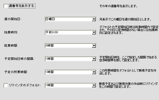 このタブを使用して、カレンダーの表示方法とデフォルトの予定時間を設定します。