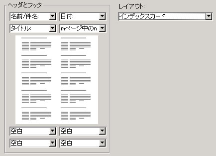 アドレス情報の印刷レイアウトです。[ユーザ設定]を指定すると、独自のレイアウトを定義できます。[インデックスカード]は、インデックスカード表示のようなレイアウトで印刷されます。[電話帳]は、電話帳のようなレイアウトで名前と電話番号が印刷され、印刷する列の数を指定できます。[メモ]は、アドレス情報をエントリごとに1ページに印刷します(メールリストには適用できません)。