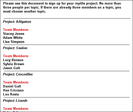 The teacher put his students into groups of three. He then posted a signup sheet so each team could sign up for a reptile that they will report on. One group of three chose Alligators.