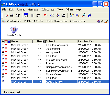 Your web site can include standard FirstClass forms, documents conferences and calendars, HTML files, and graphics. Depending on your resources, you can make your web site as simple or elaborate as required. Let’s take a look at the web site for Husky Planes.