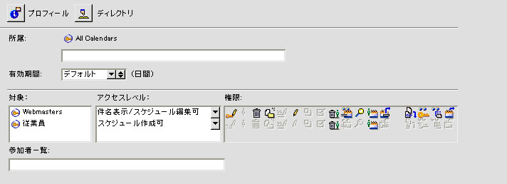 カレンダーに直接アクセスさせたいユーザの名前です。[対象]に登録したユーザでも、この[参加者一覧]に登録しないとそのユーザはカレンダーを見ることができません。ここに登録すると、登録したユーザのデスクトップにこのカレンダーが現れます。