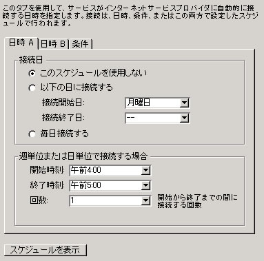 インターネットサービスでは、このタブを使用してインターネットサービスプロバイダ(ISP)へ接続するスケジュールを設定します。