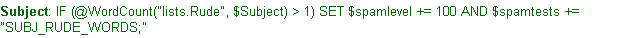 [Filters]フォルダ内のlists.Rudeドキュメントに登録された単語が2つ以上、件名に含まれているかを調べます。TRUEであれば、スパムスコアを100追加します。