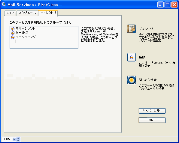 4       [ディレクトリ]タブをクリックして、このサービスを専用で使用するユーザグループ(この例では、経営管理部、営業部、マーケティング部の各ユーザグループ)を[このサービスを以下のグループに許可]に入力してください。