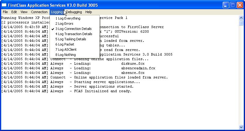 FCAS has multiple logging levels that can be turned on and off, similar to Internet Services logging, from the FirstClass Application Services console: