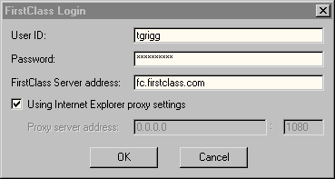 Generally, if there's no proxy server (firewall) sitting between your machine and the FirstClass server, "Proxy Server Address" should be left at its default value of "0.0.0.0 : 1080", meaning a direct connection. If your machine sits behind a proxy server (firewall), and accesses a remote FirstClass server, the proxy settings must be configured. You can usually rely on the proxy settings that were used to configure Internet Explorer on your machine.